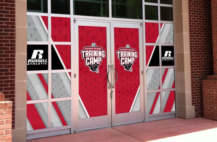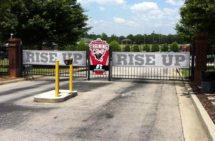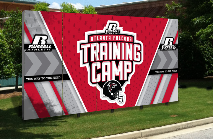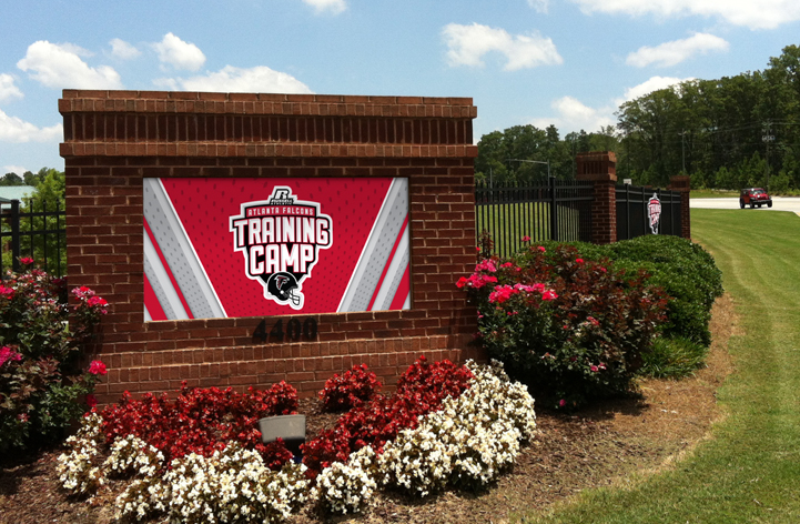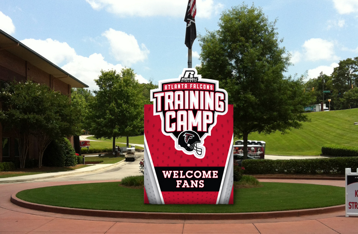 This training camp is open for the public to watch the Atlanta Falcons practice for the up-coming season. For this client we had to develop temporary signage that is eye-catching, exciting, and must also act as a form of wayfinding to direct the visitors to the field where the players are practicing. Signage included: Fence and entrance gate signs, temporary monument banner, window vinyl graphics, and two free standing signs.