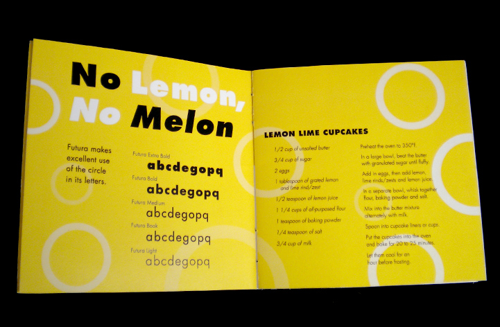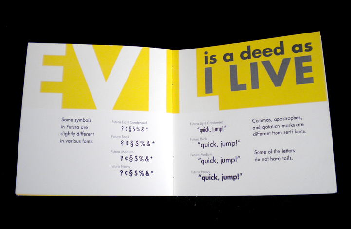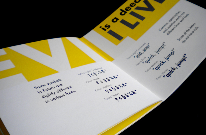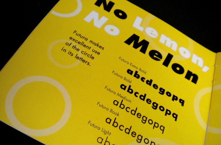 This type specimen reveals the elegance of geometry in the typeface Futura. It shows examples of the various fonts within this typeface and is exciting with the large typographic palindromes and bright yellow color.