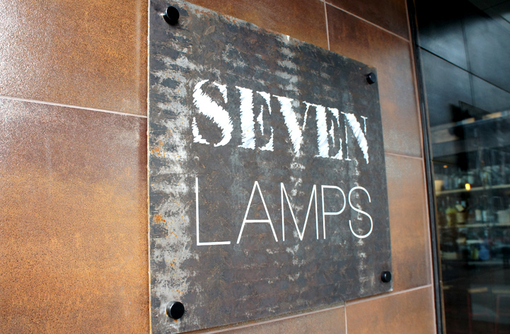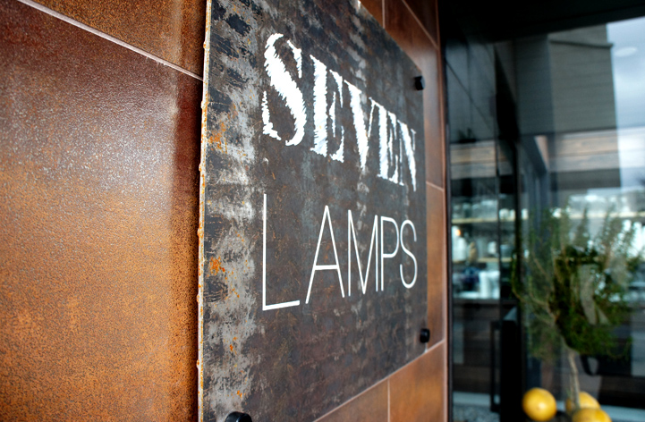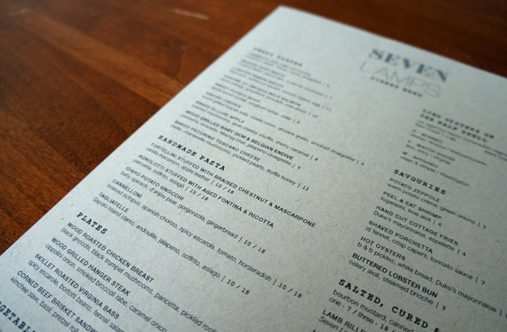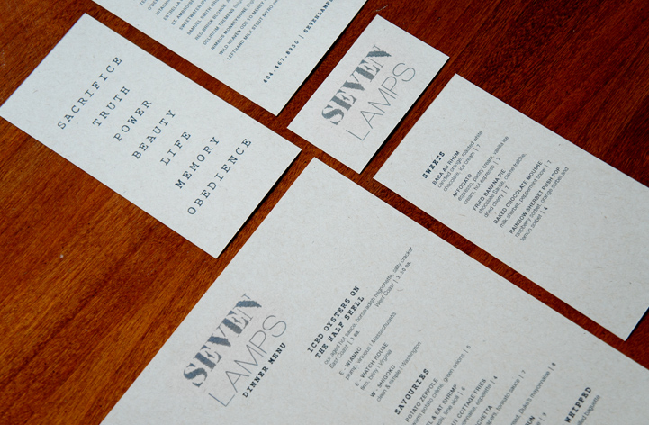 Based off the book The Seven Lamps of Architecture by John Ruskin, this craft food and drink restaurant emphasizes Ruskin's concept of staying true to materials. The signage designed is made of rusted Corten steel with a hand painted logo bringing out the rustic chic quality in the restaurant's interior. The print collateral is on a handsome brown craft paper and the logo is based off of Corbusier's typeface: Le Corbusier.